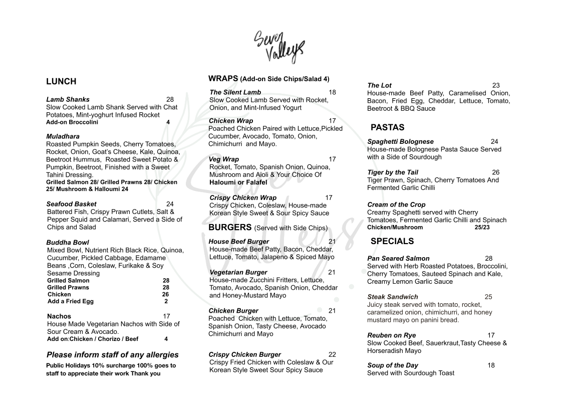 Seven Valleys Cafe offers a diverse and satisfying menu with options for every meal of the day. For breakfast, their bowls such as the Chia Sis, Blue Fairy Bowl, and Yoda Bowl are popular choices, along with the classic Butter Milk Pancakes and the indulgent Berry F. Lunch brings an equally enticing selection, including hearty options like the Milky Way salad, the crispy Seafood Basket, and the vibrant Buddha Bowl. For burger lovers, there's the House Beef Burger, Chicken Burger, and Crispy Chicken Burger, with the Pull Pork Burger and The Lot offering more substantial options. Pasta dishes like the Tiger By The Tail and Veg Patch Pasta are perfect for those craving a wholesome meal, while the Zaatar and Veg Wrap offer lighter fare. The Pulled Pork on Rye and Reuben on Rye sandwiches are notable choices for a more satisfying bite.