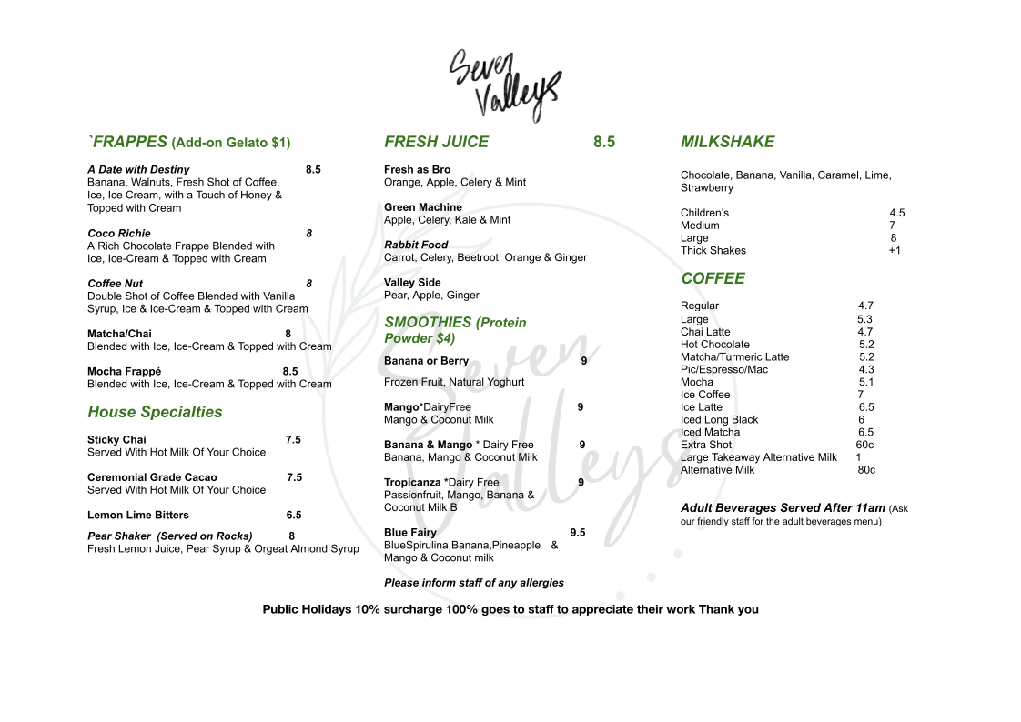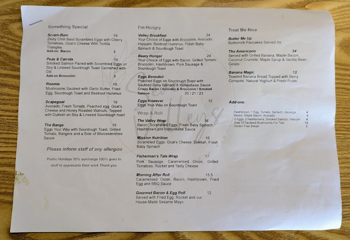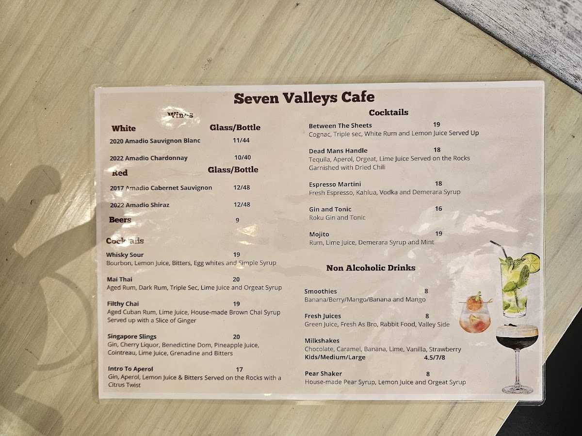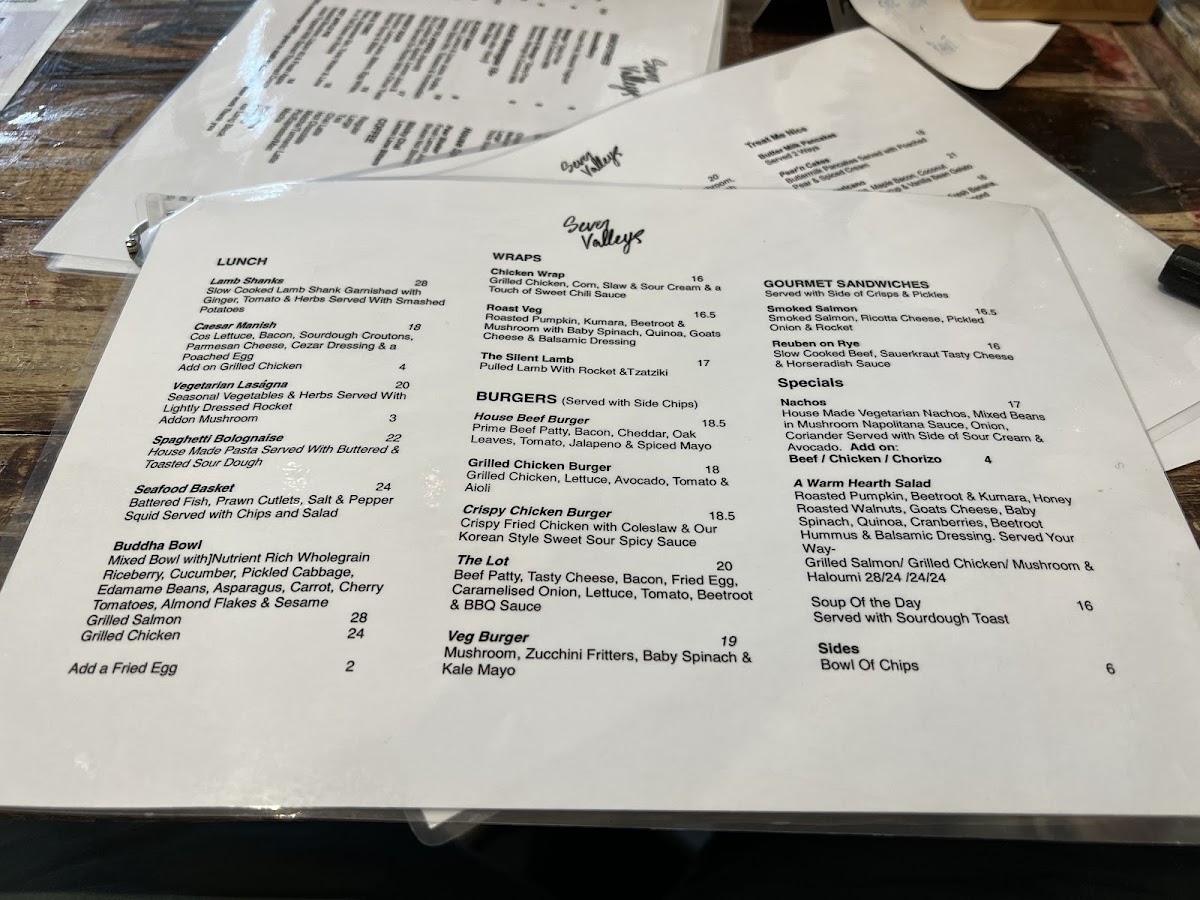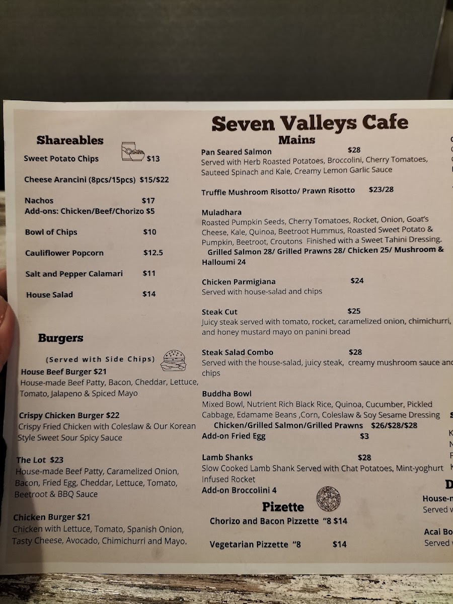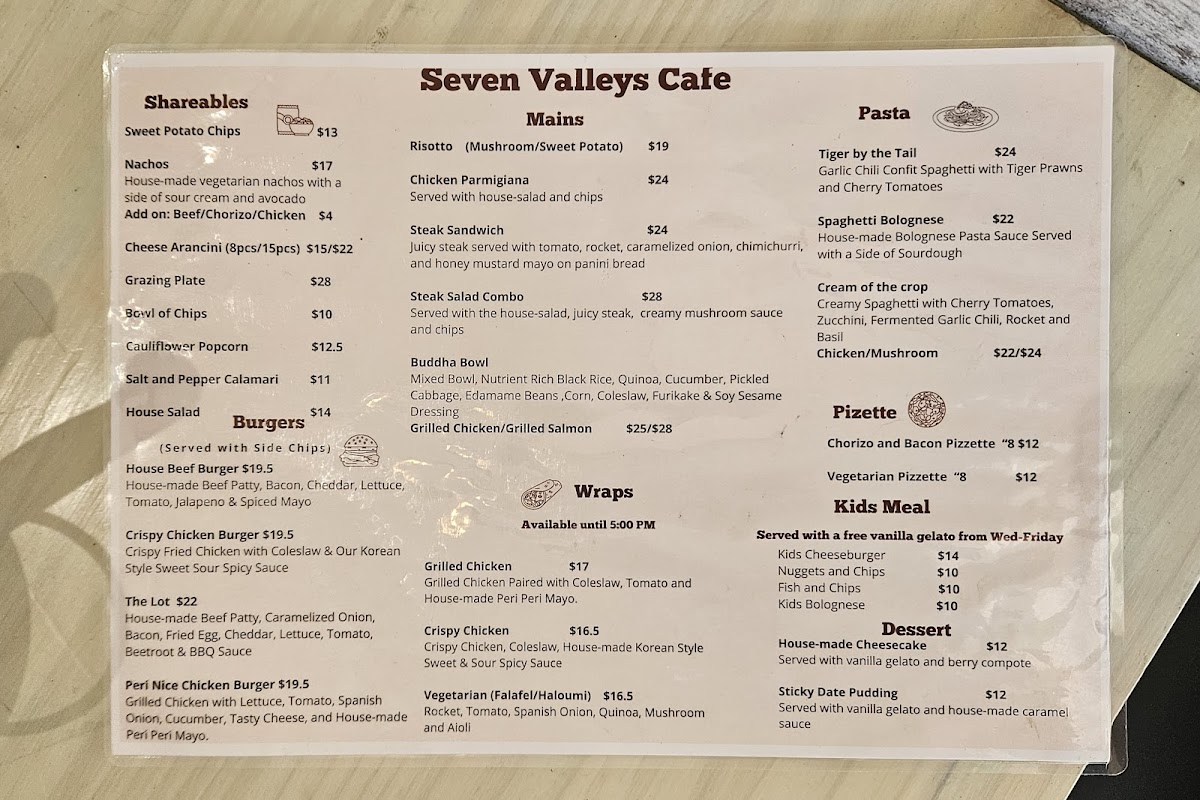 Kids have plenty of options, including Kids Pancakes, Granola Cup, and the fun Kids Nuggets & Chips. For take-away, the Bacon & Egg Roll with regular Coffee and Granola Cup are crowd-pleasers, alongside a range of wraps and toasties. The burger selection is also available to go, with favorites like the House Beef Burger and Chicken Burger. To satisfy your sweet tooth, Seven Valleys Cafe offers a tempting array of baked goods, including House Muffins, Cinnamon Bun, and Almond Croissant, as well as indulgent cakes like the Baked Ricotta Cheesecake and Chocolate Mud Cake. Whether dining in or taking out, Seven Valleys Cafe ensures there's something to satisfy every craving.